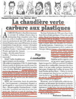 Rappelons que les CSR (Combustibles solides de récupération) sont en grande majorité des matériaux pouvant être recyclés, plastiques, mousses, caoutchoucs, blisters... provenant de produits pétroliers, mais aussi bois, papiers, cartons, tissus... A cause de leur taille et de leurs mélanges entre eux, certains finissent dans la poubelle de déchets résiduels avec les biodéchets. Mais cela concerne aussi des déchets atterrissant en déchetteries ou des déchets d'activités économiques. Le bon sens voudrait que l'on enlève ces déchets de notre poubelle résiduelle, des déchetteries et des déchets des activités économiques et que l'on trouve des solutions de recyclage ou de réutilisation. Mais les industriels qui fabriquent ces matériaux et les industriels des déchets qui veulent les brûler ne sont bien sûr pas d'accord avec cette solution. Le gâteau à se partager sur le dos des consommateurs et des contribuables est bien trop juteux ! D'autant plus que, comble de la bêtise, nos responsables politiques (voir annexe 9 de ce document et l'article ci-dessous du Canard Enchaîné) ont exempté en 2016 ces CSR de TGAP (Taxe générale sur les Activités Polluantes) qui va passer prochainement à 65 € la tonne, de contribution Climat Energie (CCE) et bénéficient même d'un taux réduit de TVA (5,5 %) sur la chaleur produite. Le pactole assuré pour cette filière qui est de plus peu créatrice d'emplois !